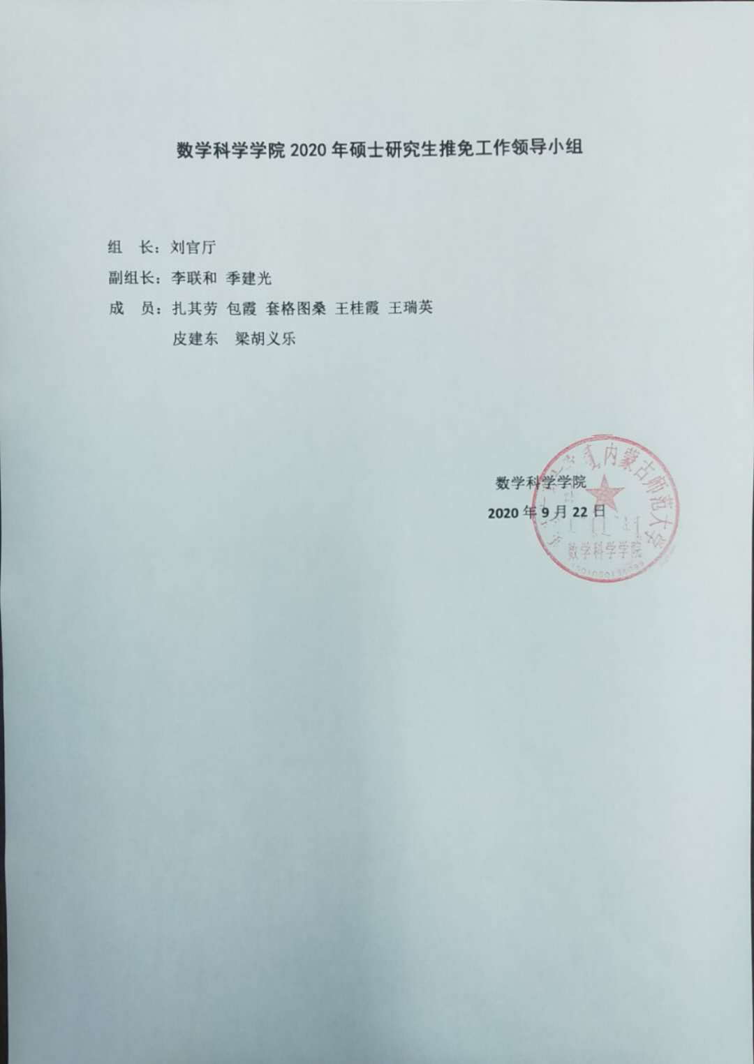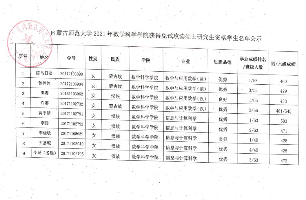 为保障推荐优秀应届本科毕业生免试攻读硕士学位研究生(以下简称推免生)工作的顺利发展,促进本科教学质量的提高,根据《内蒙古师范大学推荐优秀应届本科毕业生免试攻读硕士学位研究生工作实施办法》文件精神,结合学院实际,通过数学科学学院2021年优秀应届本科毕业生推荐免试攻读硕士学位领导小组工作(以下简称推免工作)会议,评选出了获得2021年数学科学学院推荐免试攻读硕士研究生资格的学生及预备推荐免试攻读硕士研究生资格学生名单。现对推免工作领导小组成员、获得2021年数学科学学院获得推荐免试攻读硕士研究生资格学生(预备推荐学生)名单进行公示,具体内容请见附件!