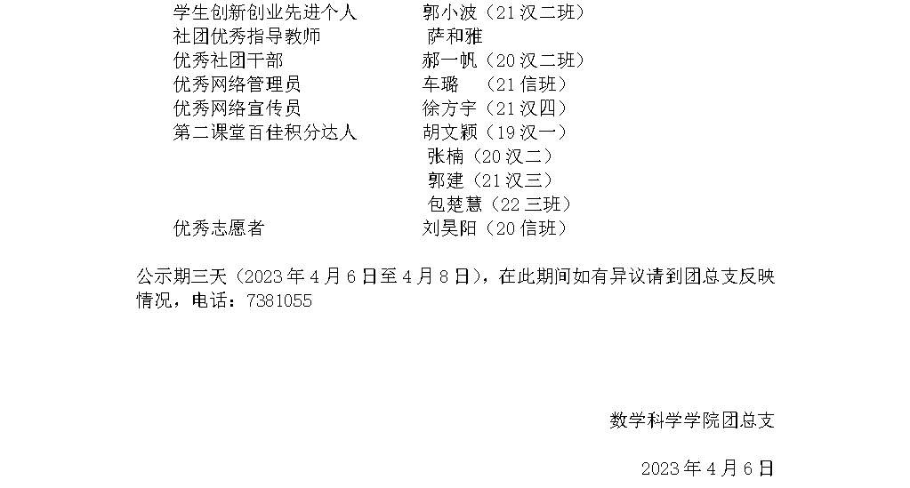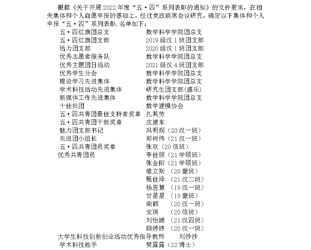 数学科学学院2022年度“五·四”系列表彰推荐名单公示