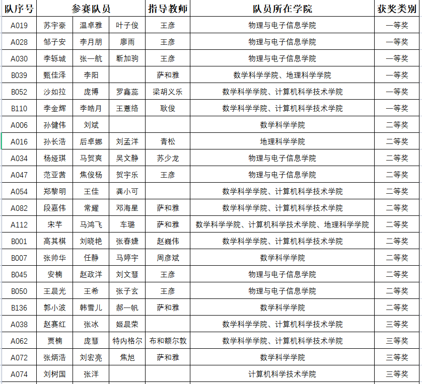 内蒙古师范大学第六届数学建模竞赛暨2023年全国大学生数学建模竞赛校级选拔赛于2023年5月12日至5月15日举行。本次比赛共有来自数学科学学院、计算机科学技术学院、物理与电子信息学院、经济管理学院、地理科学学院、化学与环境科学学院、旅游学院、教育学院、心理学院、文学院、外国语学院等11个学院共143支队伍参赛,组委会共回收论文113篇。经过组委会的认真评阅,共评出一等奖6组,二等奖12组,三等奖16组。具体名单如下: