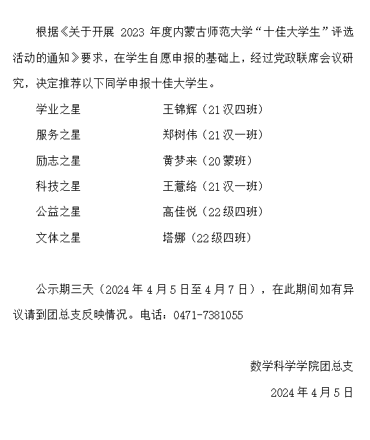数学科学学院2023年度“十佳大学生”推荐名单公示